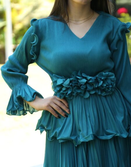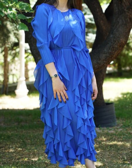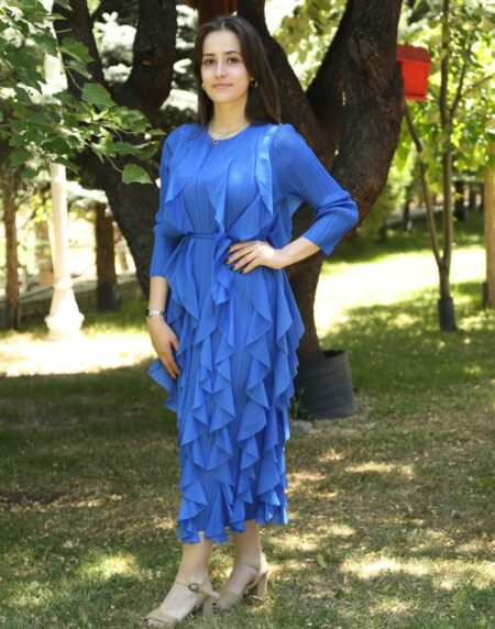 Volan Detaylı Pliseli Mavi Elbise