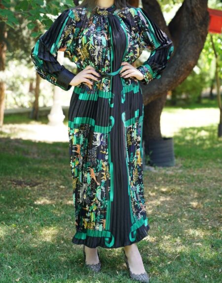 Tropikal Desenli Pliseli Elbise