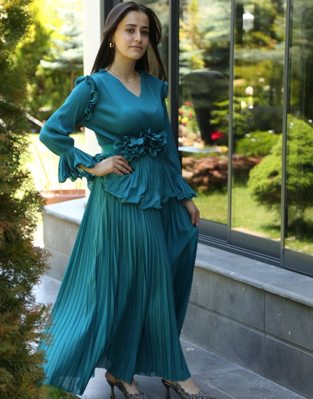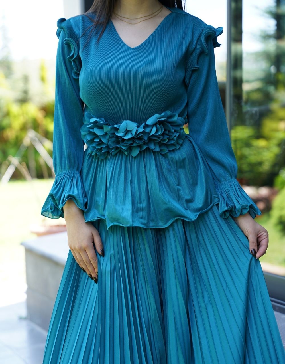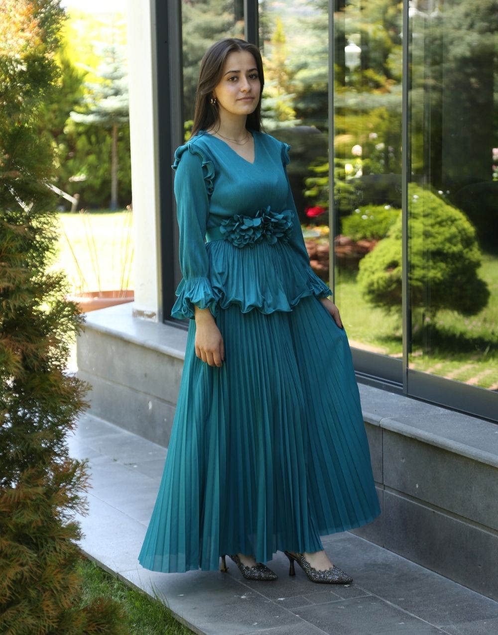 Çiçek Aplikeli Pliseli Petrol Mavisi Takım, klasik şıklığı modern dokunuşlarla birleştiriyor. Bel kısmında yer alan 3D çiçek detayları ve pliseli etek, tasarıma feminen bir zarafet katıyor. V yaka ve volanlı kol uçları ise kombini hareketlendirerek dikkat çekici bir görünüm sağlıyor. Hafif ve akıcı şifon dokusu sayesinde konforlu kullanım sunan bu takım, özel davetler ve özel günler için kusursuz bir tercih.