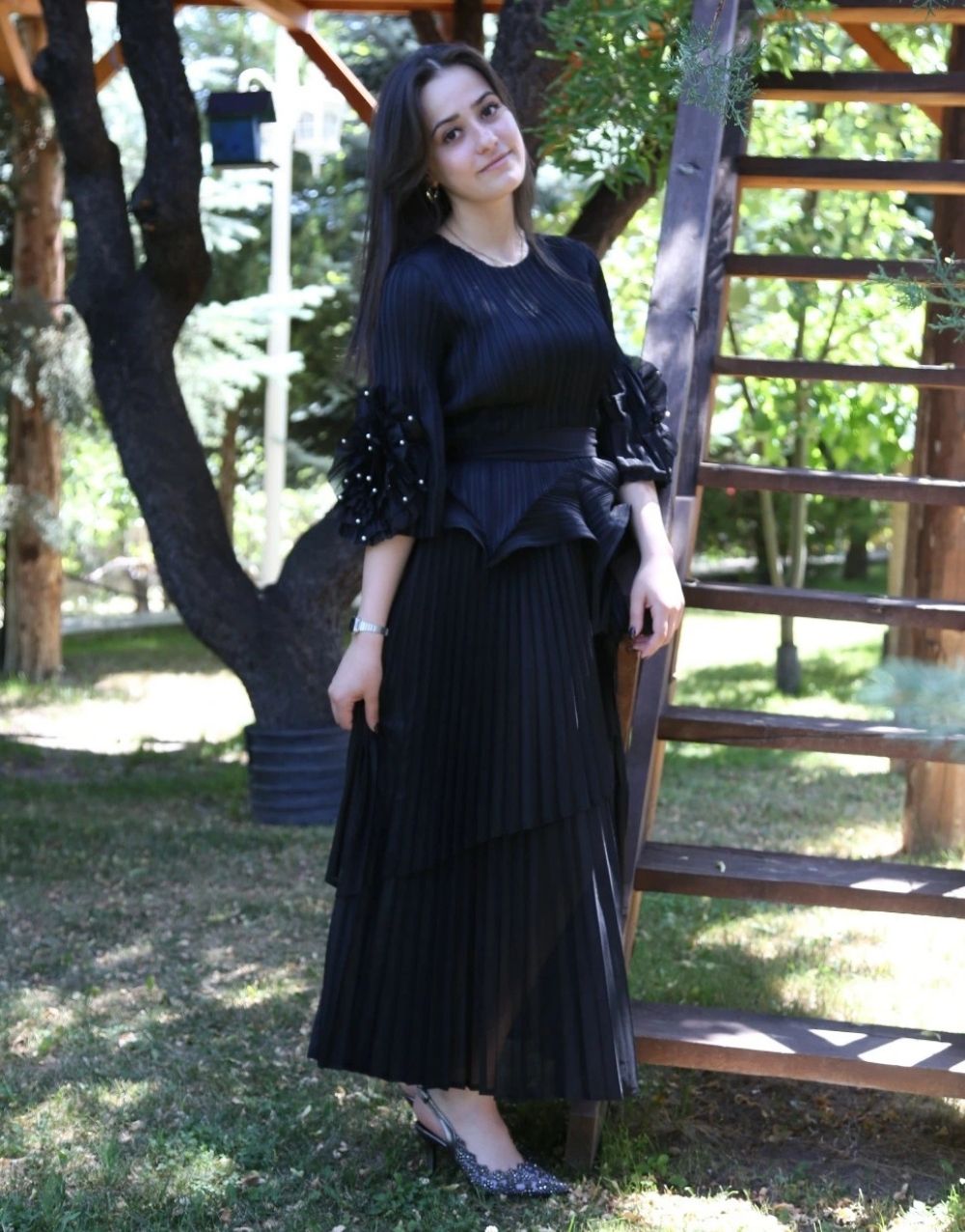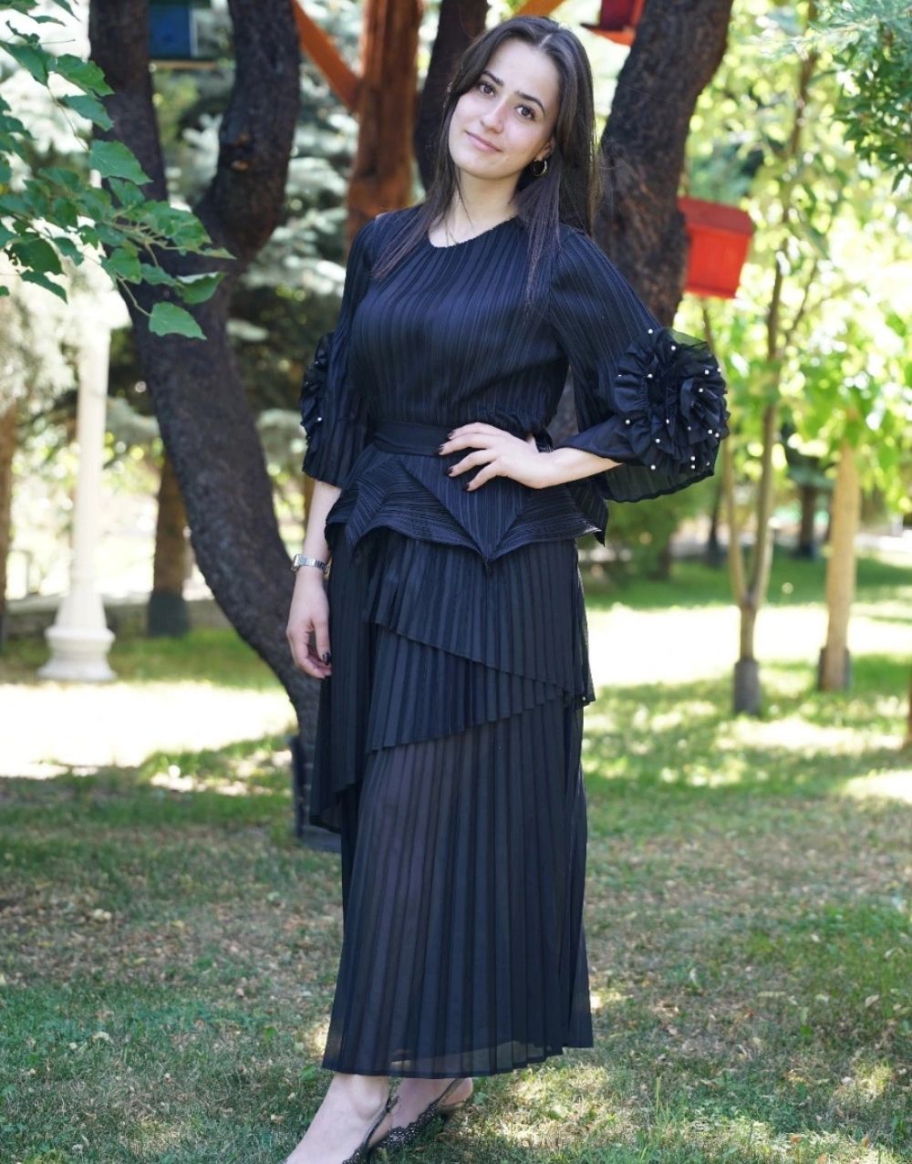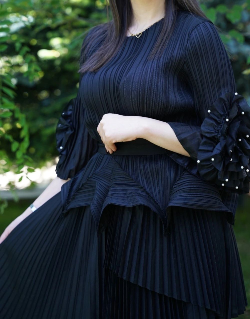 Pliseli inci detaylı siyah abiye elbise, kat kat eteği ve zarif kol tasarımıyla özel günlerde şıklığınızı ön plana çıkarır. Aybutik’te stilinizi tamamlayın.