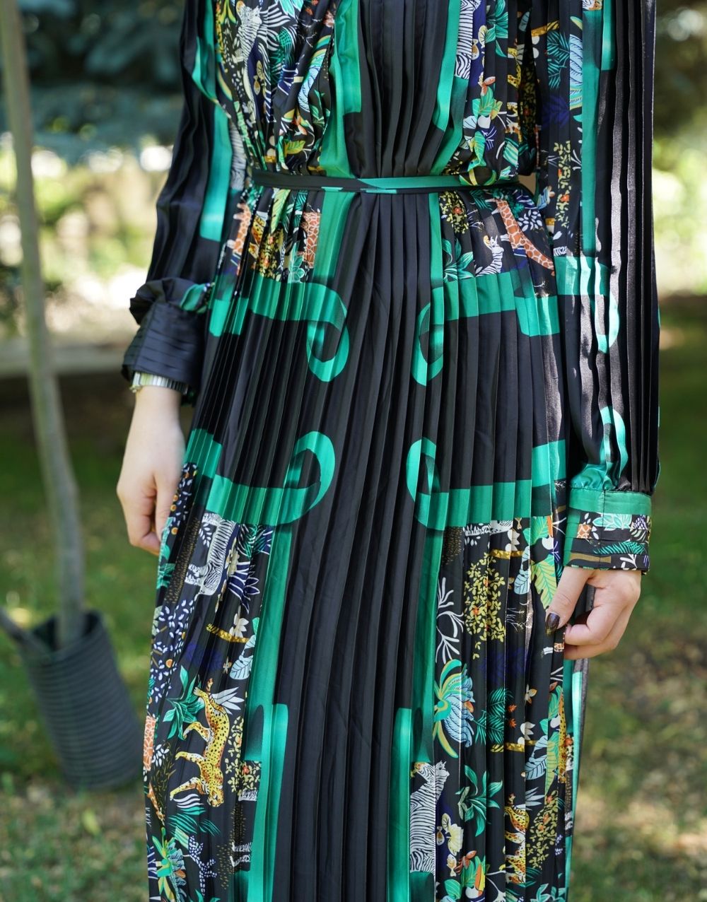 Tropikal Desenli Pliseli Elbise, canlı yeşil ve çok renkli desenleriyle göz alıcı bir stil sunuyor. Belden oturtmalı kesimi vücuda zarif bir form kazandırırken, uzun kollu ve hafif kumaş yapısı gün boyu rahatlık sağlıyor. Modern ve enerjik havasıyla hem günlük kombinler hem de özel günler için ideal bir seçimdir. Aybutik koleksiyonunda farklı ve dikkat çekici şıklık arayanlar için öne çıkıyor.