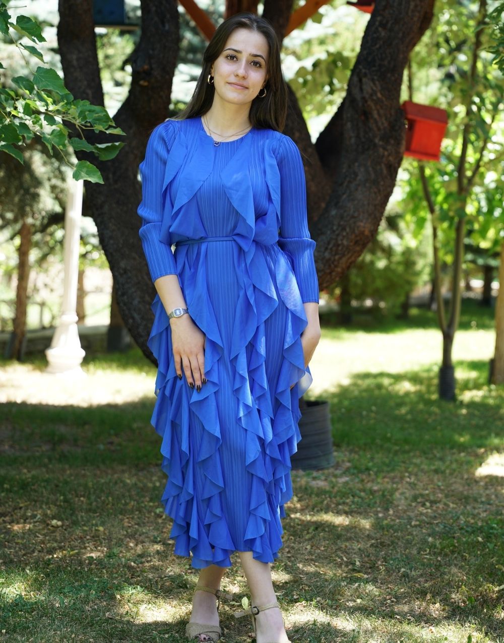Volan Detaylı Pliseli Mavi Elbise, romantik stilin modern bir yorumu olarak tasarlandı. Kollar ve gövde boyunca uzanan kat kat volan süslemeler, elbiseye hareketli ve zarif bir görünüm kazandırıyor. Hafif ve dökümlü kumaşı sayesinde gün boyu rahat bir kullanım sağlar. Şık tasarımıyla özel davetlerden romantik akşamlara kadar her ortamda fark yaratacak bu model, Aybutik’in seçkin koleksiyonunda göz dolduruyor.