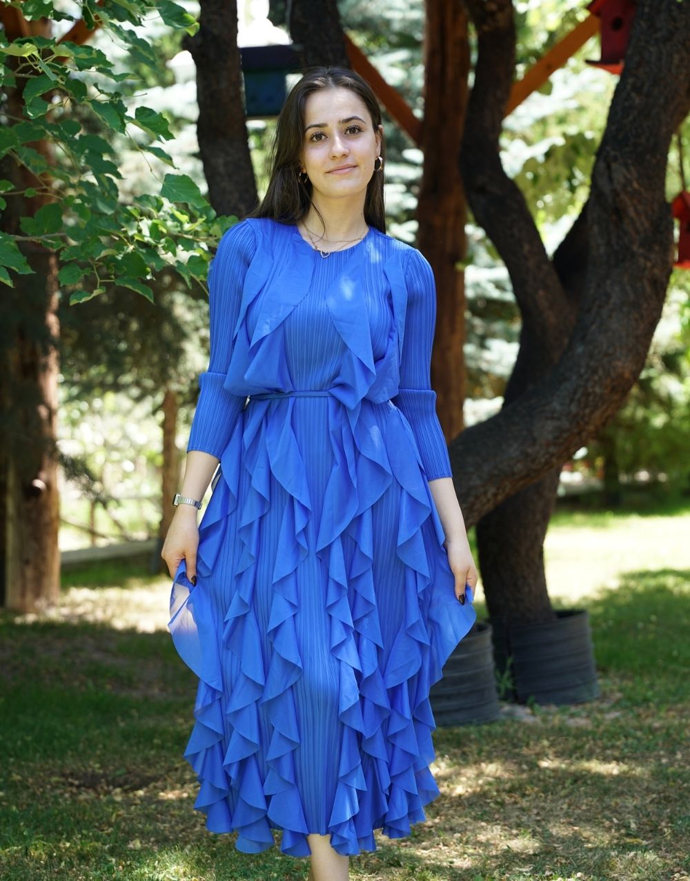 Volan Detaylı Pliseli Mavi Elbise